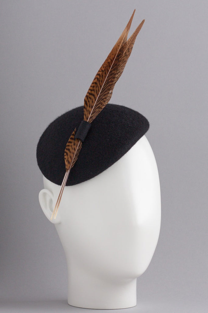 Electra is the perfect cocktail hat to wear with a little black dress. It has a teardrop shaped felt base that gives the hat a slightly vintage feel, whilst also making it elegant and easy to wear. Electra is trimmed with two golden pheasant feathers.