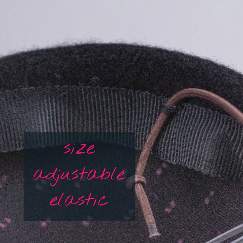 I have fitted the hat with a dark brown elastic. This elastic is designed to go around the back of your head, and sit behind your ears and at the nape of your neck. The elastic is adjustable, if you need it to be tighter then pull it further through the thread loop and tie another knot further down the elastic.