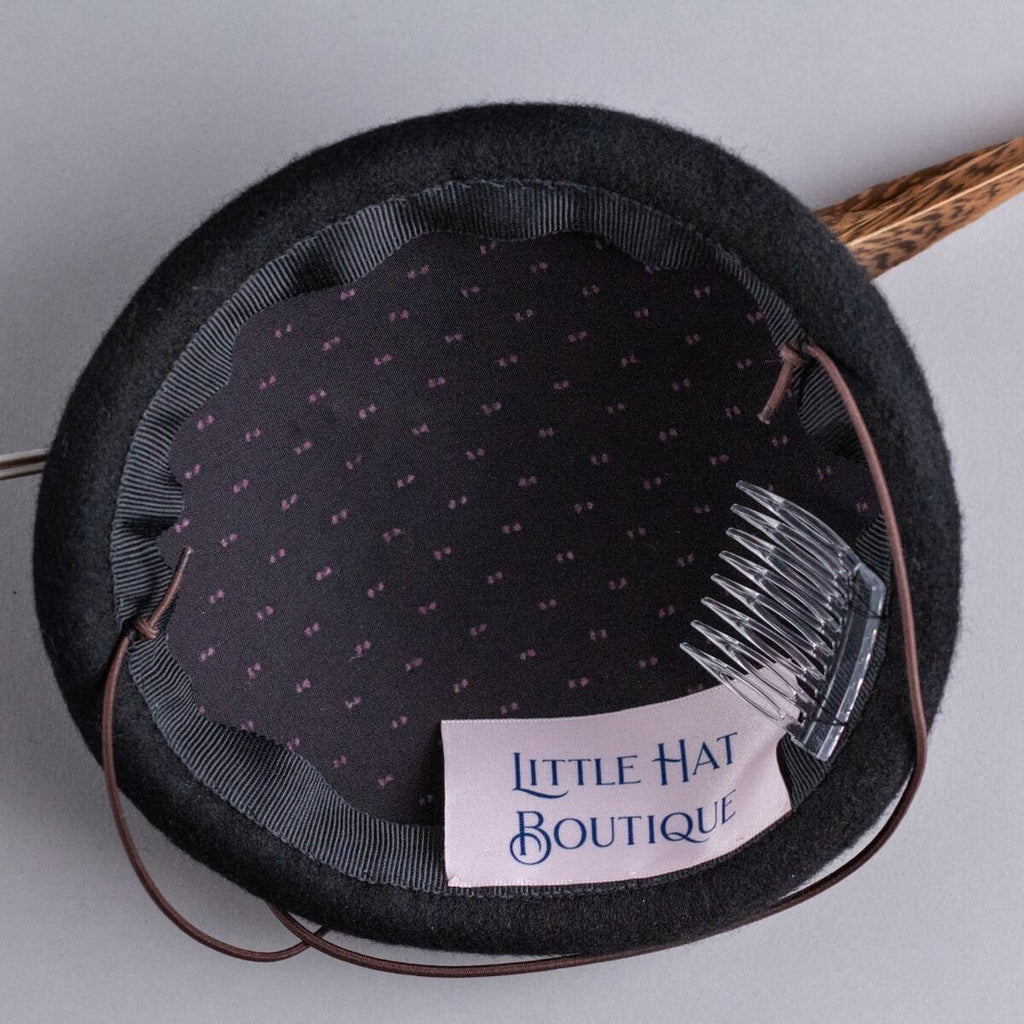This hat is handmade in London by me, Claire. I steamed and shaped the buckram and felt around a hat block that I made myself. A hat block is the shape that milliners and hatters use to mold their materials - a bit like a shoe maker’s last.
