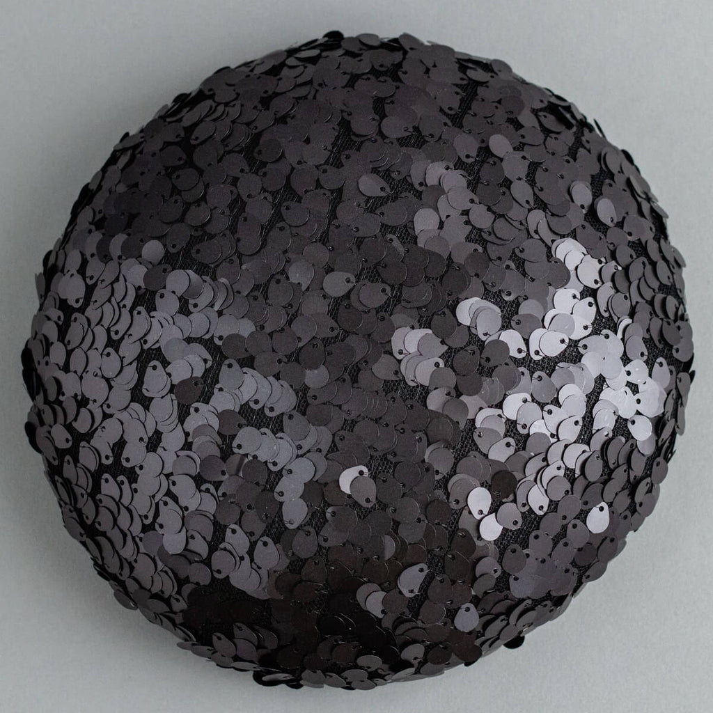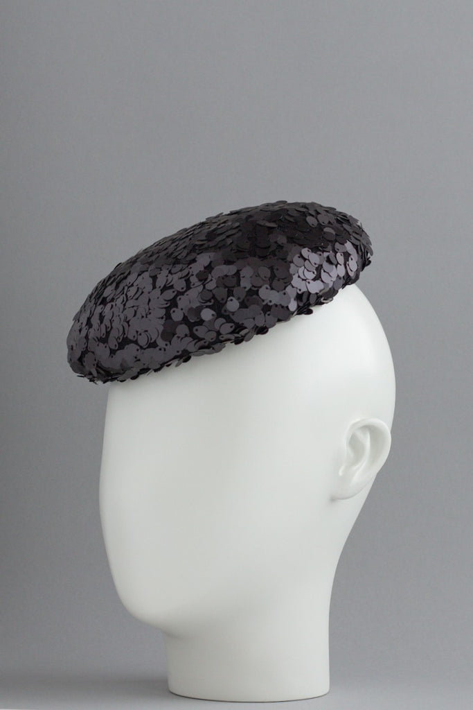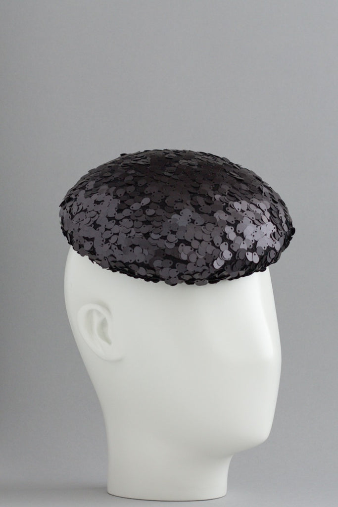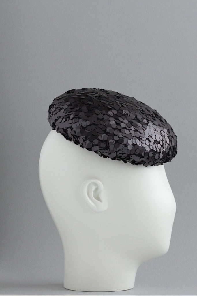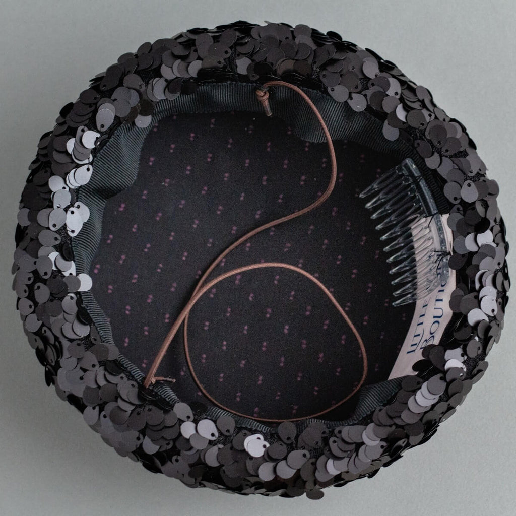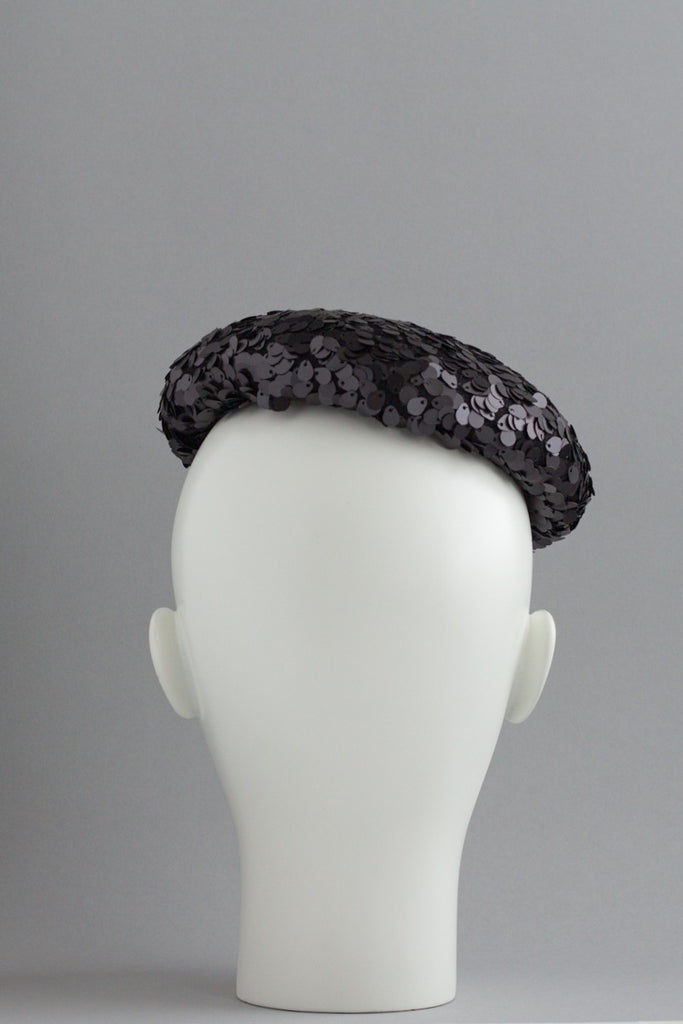 Sparkle is a cocktail hat that adds a little bit of glamour to any outfit. The charcoal sequins have a cold silvery gleam to them, which is very flattering against the skin. Who doesn't feel like a rebel when they are wearing sparkly sequins?!