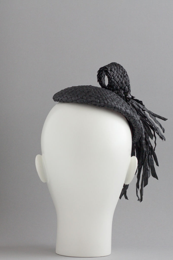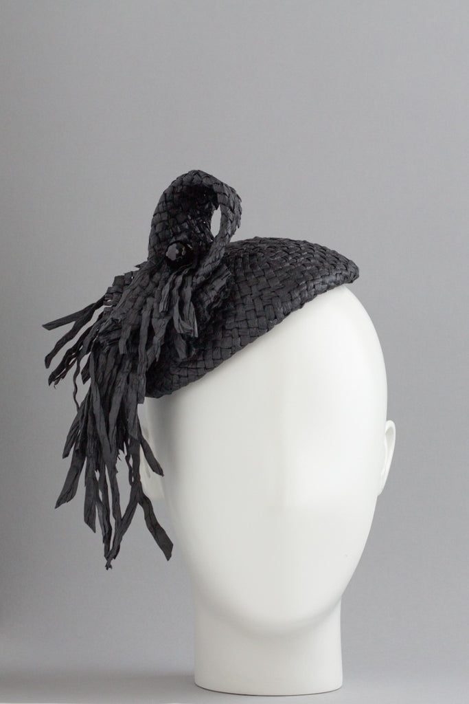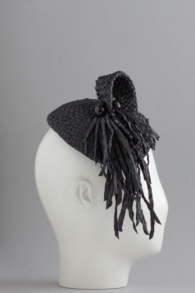 This hat is handmade in London by me, Claire. I bought the woven raffia from a UK supplier, and then formed it over a teardrop shaped hat mould using a little bit of hat making know how.