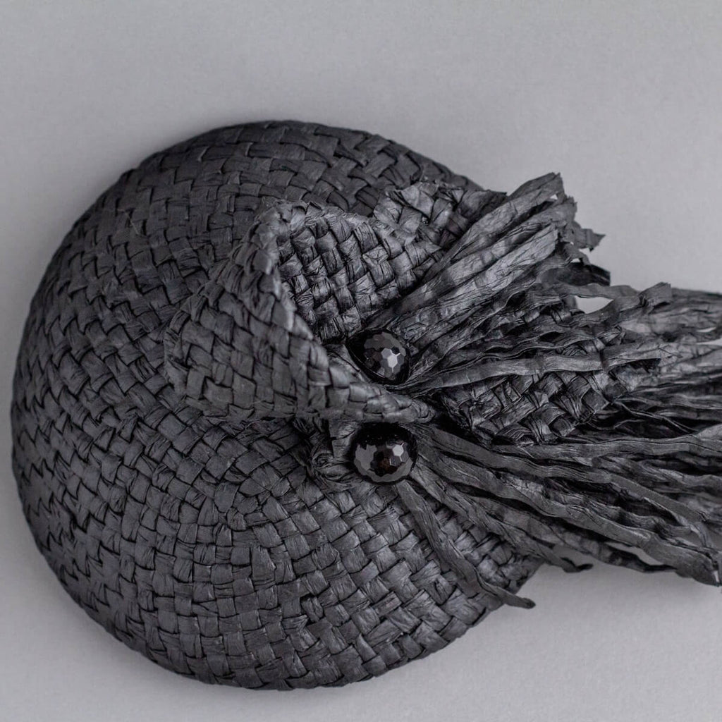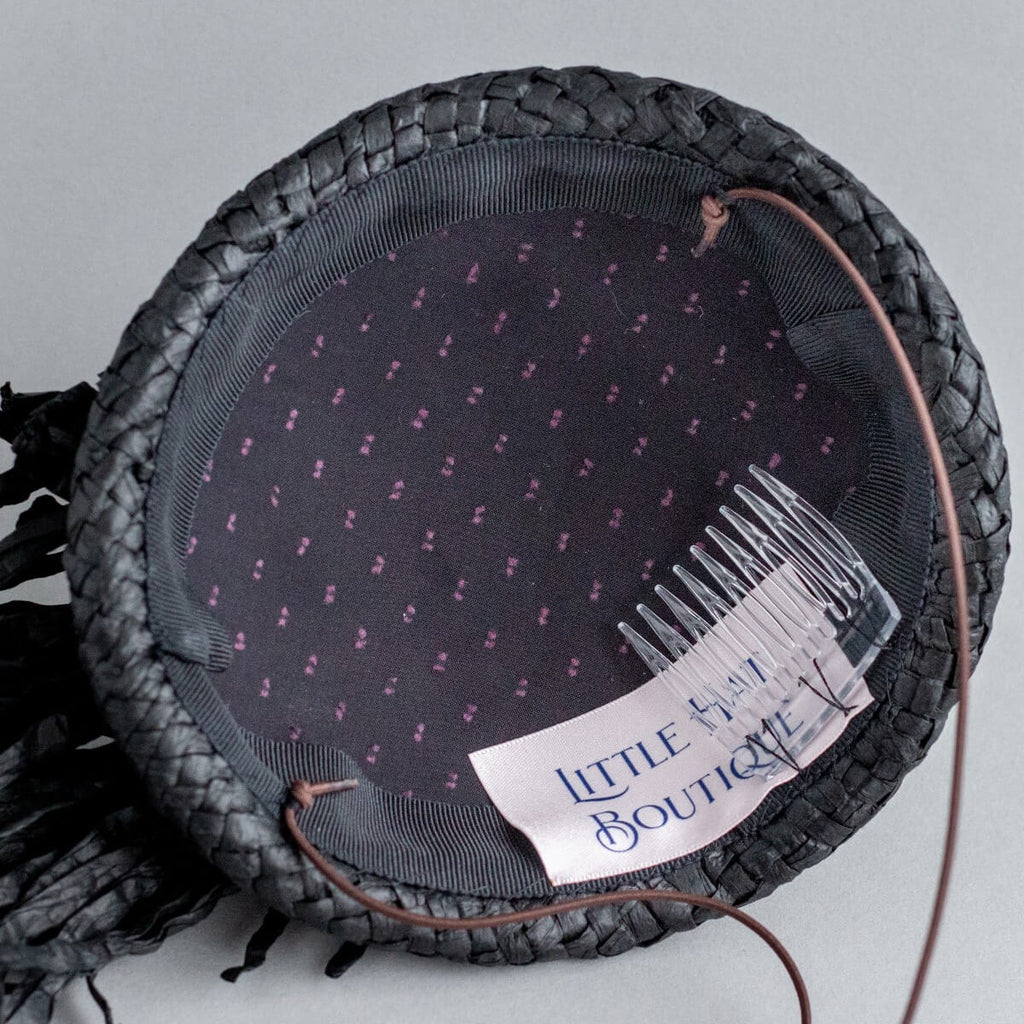 ★ woven raffia hat body ★ faceted glossy black buttons from a little independent boutique in Paris ★ swiss dot 100% cotton lining ★ internal wire edging ★ buckram interlining for hat sturdiness ★ size adjustable dark brown elastic ★ clear plastic comb ★ black millinery petersham (70% rayon, 30% viscose) ★