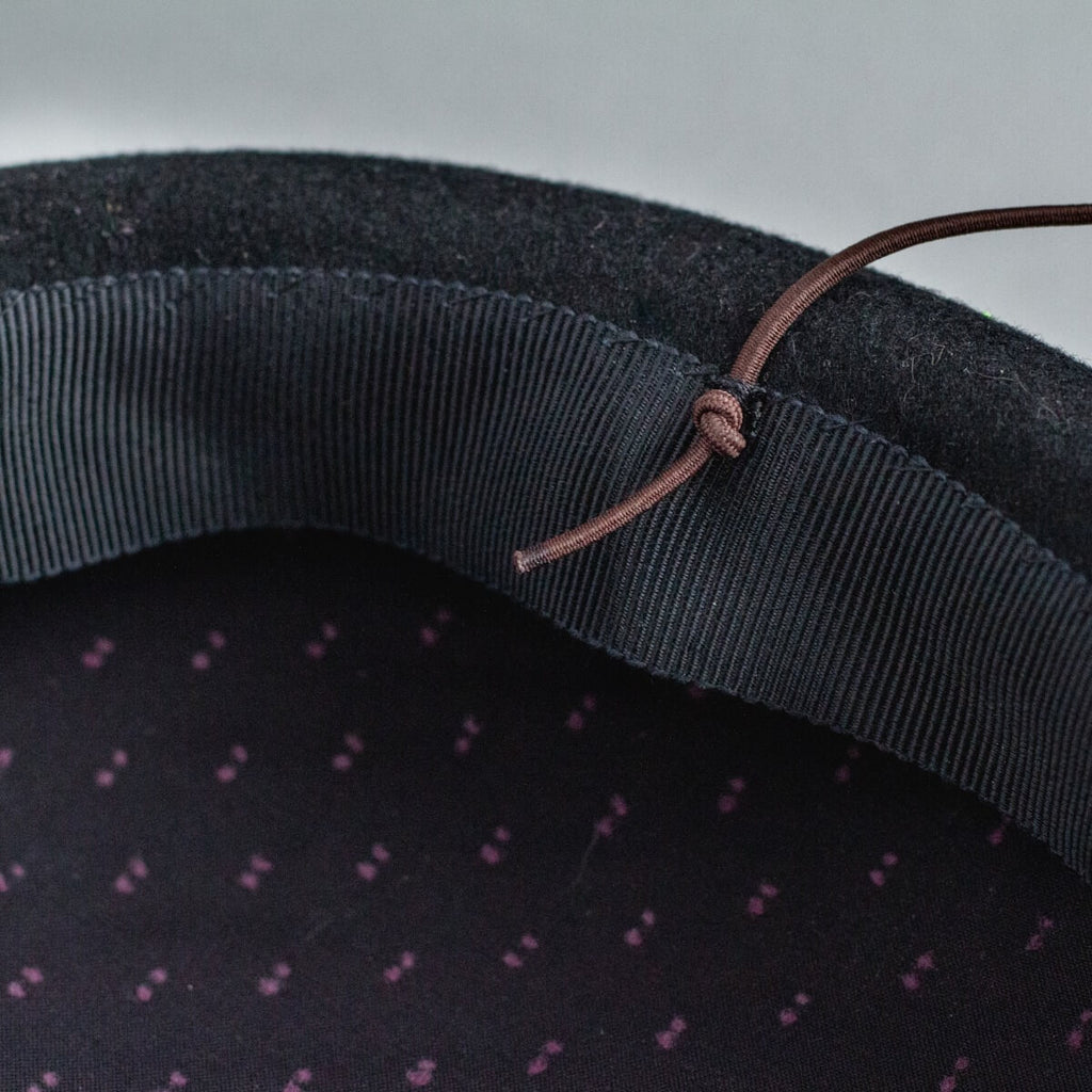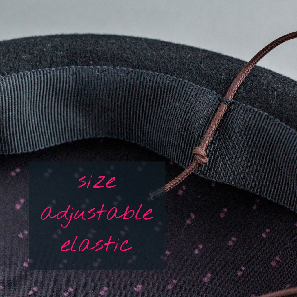 I have fitted the hat with a dark brown elastic. This elastic is designed to go around the back of your head, and sit behind your ears and at the nape of your neck. The elastic is adjustable, if you need it to be tighter then pull it further through the thread loop and tie another knot further down the elastic.